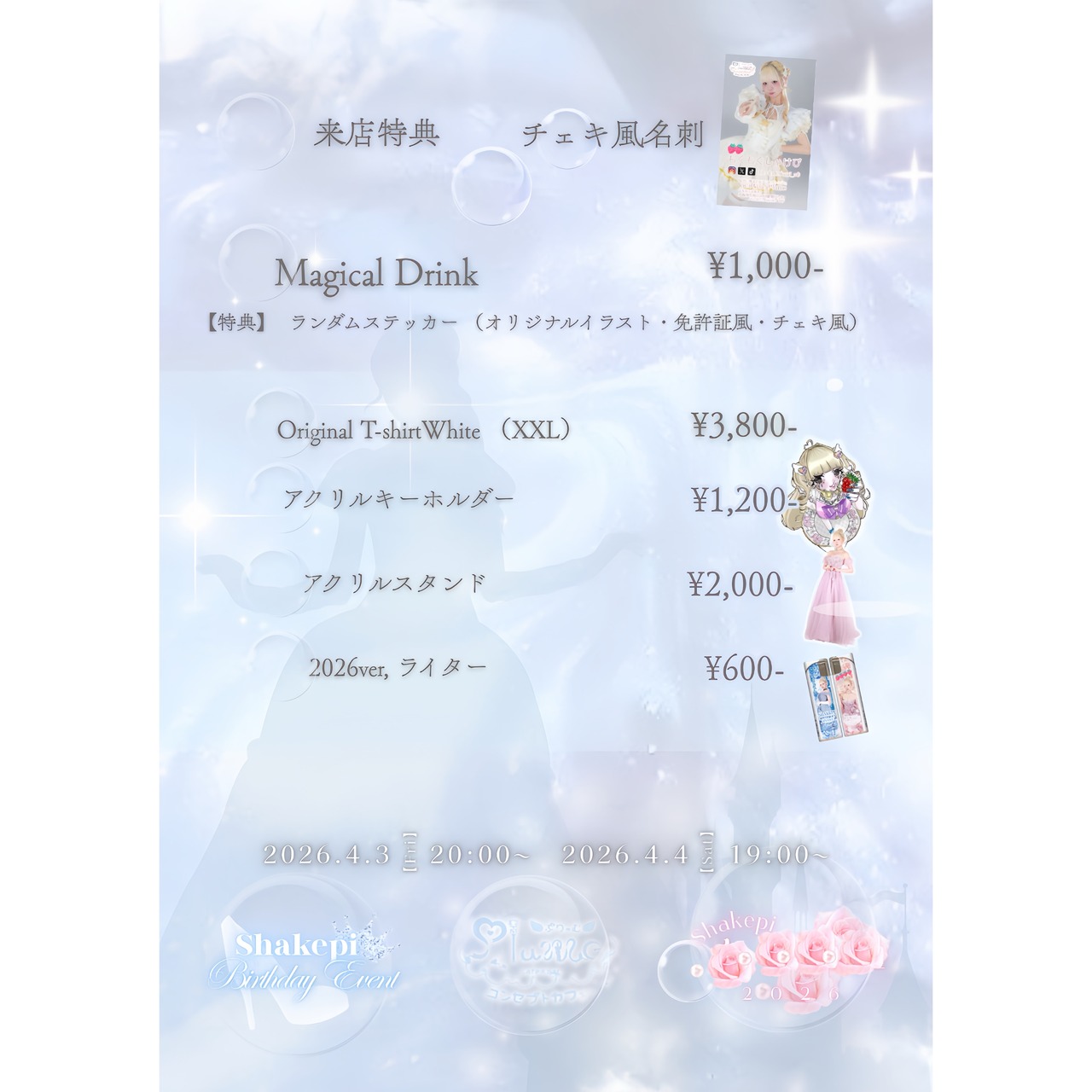 シャンパン特典の○○衣装ブロマイド、オリジナルライターと来店特典のチェキ風名刺は郵送にてのお届けとなります!